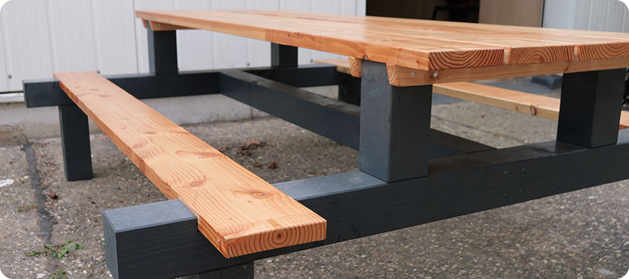 Bevor Sie die Tischbeine und Querbalken montieren, streichen Sie die Balken, Ausklinkungen und Tischfüße mit einer Schutzschicht. Dies bietet zusätzlichen Schutz gegen Feuchtigkeit und verlängert die Lebensdauer des Holzes. Die Bohlen bleiben zunächst unbehandelt, sollten jedoch später mit einer Lasur geschützt werden, um sie wetterfest zu machen.